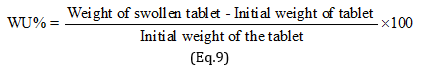 The swelling index of tablets was determined by using 0.1 N HCl (pH 1.2) at room temperature. The swollen weight of the tablets was determined at predefined time intervals. The Swelling characteristics were expressed in terms of percentage water uptake (WU %) according to the equation 8.