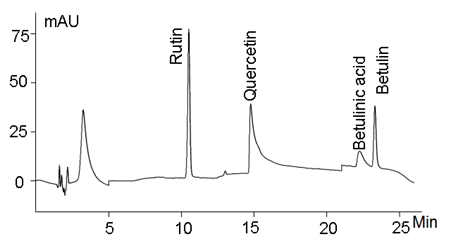 Fig. 1 presents the chromatogram of a standard mixture of rutin, quercetin, betulin and betulinic acid (Fig.1a), and a chromatogram of one of the model extracts (D60 from table 1)–Fig.1b) as an illustration of the results presented on table 2.