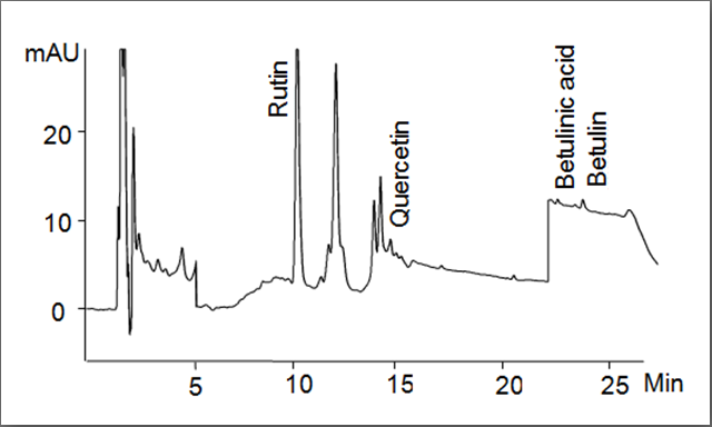 Fig. 1 a): HPLC chromatogram of a standard mixture of rutin, quercetin, betulinic acid and betulin