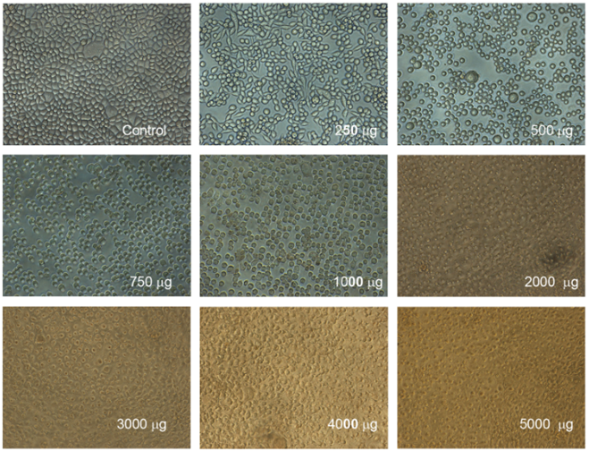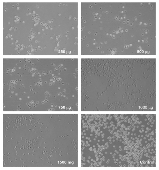 However, at concentrations higher than 1000 μg/ml, cells were not round. They remained firmly bound to the substrate, but with strongly altered morphology and vitality (fig. 3b).