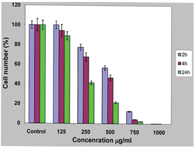 In vitro study of antiproliferative activity of FB Dry 2 extract showed that the extract caused irreversible morphological changes in mouse lymphoma L5178Y cells several hours after the initial treatment (fig. 2a). Reduction of cell numbers was reported after 2, 4 and 24 hours exposure to the extract (fig. 2b). Concentration of 1000 μg/ml FB Dry 2 extract lead to single living cells for only 2 hours of exposure, while after 4 and 24 hours all cells were dead. Decrease of the extract concentrations increased the number of surviving cells. At a concentration of 125 μg/ml (for 4 and 24 hours of treatment) surviving cells were over 90 % and for 2 hours after treatment there were no dead cells.