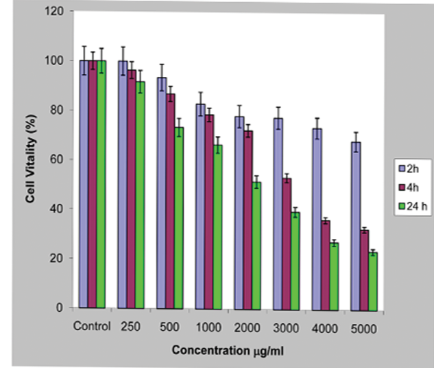 Fig. 3 b): Reduction of cell vitality in cultures of McCoy-Plovdiv cells after treatment with FB Dry 2 extract for 2, 4 and 24 hours with concentrations: 250, 500, 750, 1000, 2000, 3000, 4000 and 5000 μg/ml