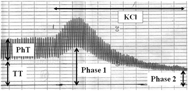 Fig. 4: Mechanogram of smooth muscle samples showing tonic tension (TT), phasic tension amplitude (PhT), an initial transient state–Phase 1 (Ph1) and a subsequent sustained state–Phase 2 (Ph2) of KCl-depolarisation solution (KCl-contracture)