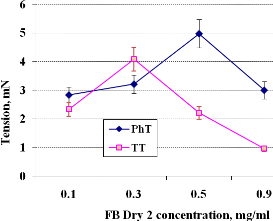 Introduction of the FB Dry 2 extract into the smooth muscle bath (at concentration from 0.1 to 0.9 mg/ml) have a biphasic effect on the smooth muscle isometric tension. Following increase of the concentration, FB extract potentiates isometric force generation. At higher concentrations the extract inhibits the spontaneous muscle activity (fig. 5).