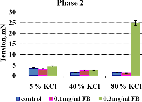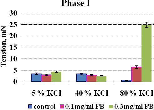 Stimulation effect of FB Dry 2 extract concentrations of 0.1 mg/ml and 0.3 mg/ml were investigated by evoked KCl-contracture. The initial transient state (Phase 1) and a subsequent sustained state (Phase 2) are illustrated in the presence of 0.1 mg/ml and 0.3 mg/ml of the extract (on fig. 6).