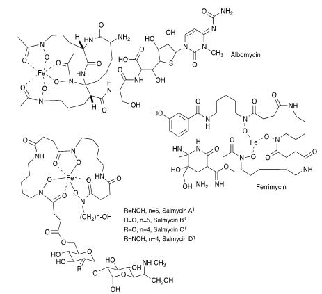 Antibiotic resistance by bacteria continues to unfold as a major problem facing the health industry and requires new and efficient therapeutics [13]. Bacterial pathogens resist antibiotics with strategies such as the outer membrane permeability barrier, drug inactivating enzymes, target al. teration and efflux [14]. The outer membrane permeability barrier is particularly severe in Gram-negative bacteria such as Pseudomonas aeruginosa, Burkholderia cepacia, and Streptophomonasmaltophilia which are the major pathogens associated with pneumonia and bacteremia in immunocompromised hosts, having destructive lung infections, in cystic fibrosis patients, and with severe nosocomial infections in ventilated patients [14]. Pseudomonas aeruginosa is well known for its ability to develop multidrug resistance after antibiotic therapy. One of the strategies to overcome these resistance mechanisms is by the “ill-use” of bacterial iron transport systems–siderophores. Since they are vital for virulence and persistence of bacteria on the infected host, they can go through the permeability barrier carrying a “payload” of an antibiotic. There are several natural siderophore-antibiotic conjugates (SDCs) called sideromycins produced by bacteria such as albomycin (fig. 3) by Actinomycessubtropicus[15], ferrimycin by Streptomyces griseoflavus[16], and salmycin by Streptomyces violaceus[17] where the antibiotic is covalently attached to the siderophore. These sideromycins which are actively transported into bacteria can lower the minimum inhibitory concentration of the antibiotic as much as 100 fold [18].