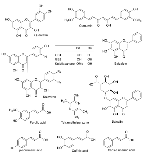 Foods having plant polyphenols and flavonoid compounds may have advantages not only as powerful antioxidants, but also as iron chelators[26, 27]. Iron chelation by polyphenols can completely inhibit free radical generation, showing that chelation may be important to their antioxidant activity. These data validate that quercetin (fig. 5) and other phenolic compounds can successfully control iron biochemistry under physiological conditions, thus offering insight into the mechanism of action of bioactive phenolics. In addition,curcumin isolated from Picrorhizakurroa[28], kolaviron from Garcinia kola [29], baicalein and its glycoside baicalein, the major bioactive compounds found in the Chinese herb Scutellariabaicalensis[30], tetramethylpyrazine and ferulic acid, from the Chinese herbal medicine Ligusticumwallichi[31] and p-courmaric acid found in many sources including Costusspeciosus [32] have been implicated in iron chelation resulting in anticancer activity [33]. Recently, Coriander sativa in extracts, containing high phenol and flavonoid content, the antioxidant activity correlated with the iron chelating potential [34]. Siderophores have also the ability to activate plant immunity [35, 36]. In Arabidopsis plants, the siderophonedeferrioxamine was able to provide protection against the pathogenic bacterium Pseudomonas syringaepv tomato DC3000.