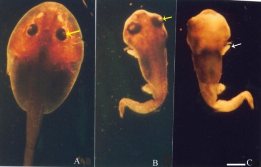 Fig. 2: Magnified view of the tadpoles of Duttaphrynus melanostictus shown in fig. 1, A. Dorsal view of the tadpole of control group, showing median position of eye (yellow arrow). B. Dorsal view of the 200ng/ml treated tadpole showing derso-lateral position of eye (yellow arrow). C. Ventral view of the 200ng/ml treated tadpole showing emergence of partially differentiated forelimb (left side, white arrow1), a bent and partially regressed tail. Scale bar = 1 mm