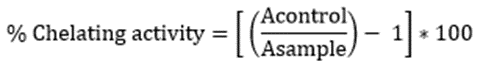 The chelating activities of extracts on Fe2+were estimated based on the decrease in the maximal absorbance of the iron (Fe2+)–ferrozine complex. 1 ml of extracts/standard was incubated with 0.5 ml of ferrous chloride (1.0 mmol). The reaction was initiated by the addition of 1 ml of ferrozine (5.0 mmol) and the total reaction volume was adjusted to 4 ml with ethanol. After the mixture had reached equilibrium (10 min), the absorbance was measured at 562 nm [11]. The negative control was prepared without the extract and EDTA was used as the positive control. The chelating activity of the extract on Fe2+was calculated as follows: