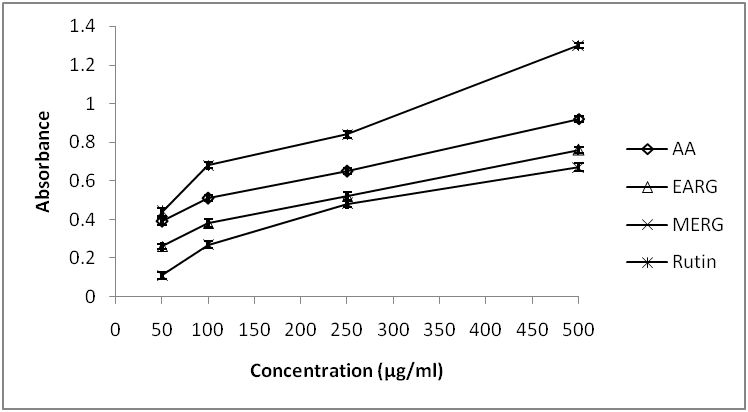 Different concentration of extracts (50-500 μg/ml) in 1 ml of alcohol was mixed with 2.5 ml phosphate buffers (0.2 M, pH 6.6) and 2.5 ml of 1% potassium ferricyanide. The mixture was incubated at 50 °C for 20 min and 2.5 ml of 10% trichloroacetic acid was added. The reaction mixture was then centrifuged for 10 min. Further, 2.5 ml of the supernatant solution was mixed with 2.5 ml of distilled water and 0.5 ml of 0.1% FeCl3. The absorbance was measured at 700 nm [8].