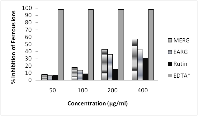 Elemental species such as ferrous iron (Fe2+) can help in production of reactive oxygen species (ROS) within the body and accordingly the ability of substances to chelate iron can be a measure of its antioxidant capacity [19]. Transition metals acts as catalyst in Fenton type reactions and catalysis of hydroperoxide. Chelation of these ions by antioxidants prevents the catalytic action of metal ions [20]. Chelating agents also reduce the redox potential and thus stabilize the oxidized form of the metal ions and serve as antioxidants. The Ribes glaciale extracts were also evaluated for iron (II) chelating ability (fig. 2). At 400 µg/ml, the methanolic and ethyl acetate extract inhibited 61% and 47% of ferrous ion respectively. The chelating activity of the extracts was higher than rutin and significantly lower than the standard EDTA. It has also been reported that phenolic compounds with a properly oriented functional groups can chelate with metal ions and therefore the phenolic compounds in the methanolic extract with properly oriented functional groups may be held responsible for its higher chelating activity.
