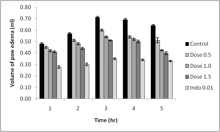 Administration of methanolic extract at the dose of 500, 1000 and 1500 mg/kg significantly reduced the volume of carrageenan induced paw edema (fig. 3). The inhibiting effect of the methanolic extract at the dose of 1000 mg/kg (p<0.05) and 1500 mg/kg (p<0.01) was significant when compared to control group. The reduction in paw volume edema 3 h after carrageenan injection was 33% and 50% respectively by indomethacin (10 mg/kg) and methanolic extract (1500 mg/kg). Similarly, the reduction in paw volume edema 5 h after carrageenan injection was 48% and 47% respectively by indomethacin and methanolic extract.