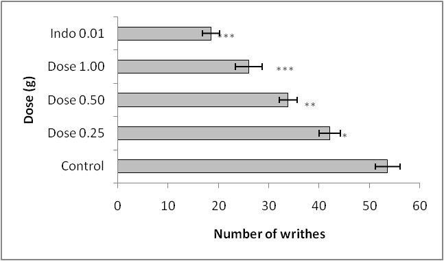 The methanolic extract significantly (p<0.05) inhibited the number of writhes induced by acetic acid in comparison to control (fig. 4) at the dose of 500 mg/kg and 1000 mg/kg. The extract at the dose of 250, 500 and 1000 mg/kg inhibited 21%, 36% and 51% of the writhes induced by acetic acid respectively. Indomethacin (10 mg/kg) inhibited 65% of writhes in comparison to control (p<0.001).