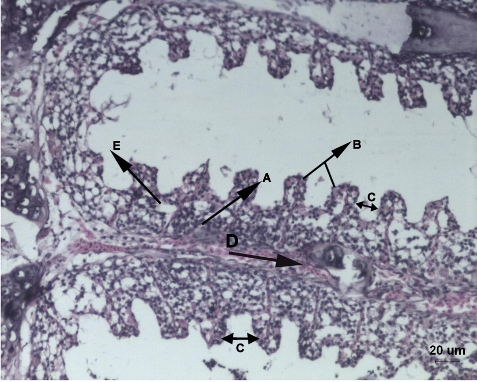 Fig. 1: A Photomicrograph of gills of control fish Labeo rohita stained with Hematoxylin and Eosin demonstrating normal gill structure. A-Primary Lamellae (PL), B-Secondary Lamellae (SL), C-Inter Lamellar Space (ILS), D-Cartiligous Rod, E-Primary Epithelium (PE). Scale Bar = 20 µm