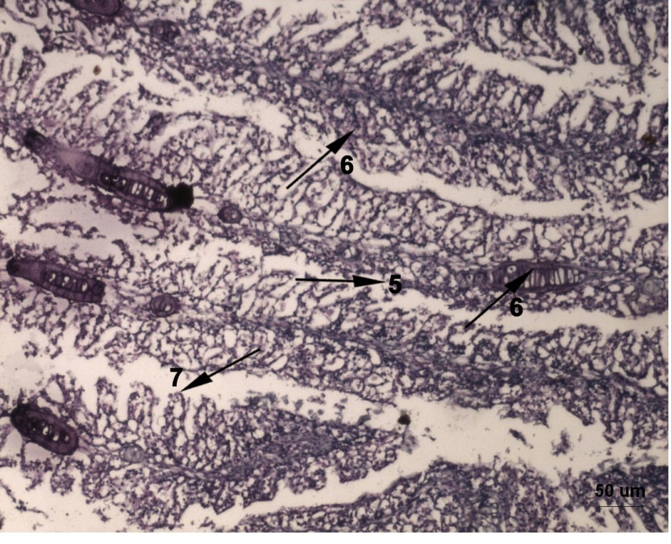 Fig. 3: Histological alterations of gills of Labeo rohita fish exposed to lead acetate and fed with normal fish food stained with Hematoxylin and Eosin showing 5-Fusion of Secondary Lamella, 6-Disappearance of Inter Lamellar Space, 7-Degeneration of Primary Filaments. Scale Bar = 20 µm