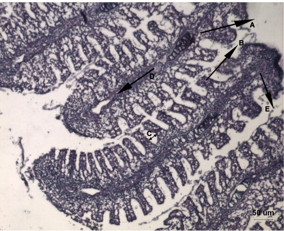 Fig. 4: Histological alterations of gills of Labeo rohita fish exposed to lead acetate and fed with normal fish food supplemented Hydrilla verticillata stained with Hematoxylin and Eosin showing normal architecture. A-Primary Lamellae (PL), B-Secondary Lamellae (SL), C-Inter Lamellar Space (ILS), D-Cartiligous Rod, E-Primary Epithelium (PE). Scale Bar = 50 µm