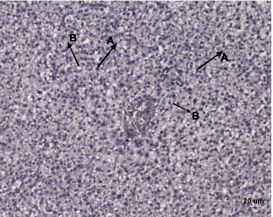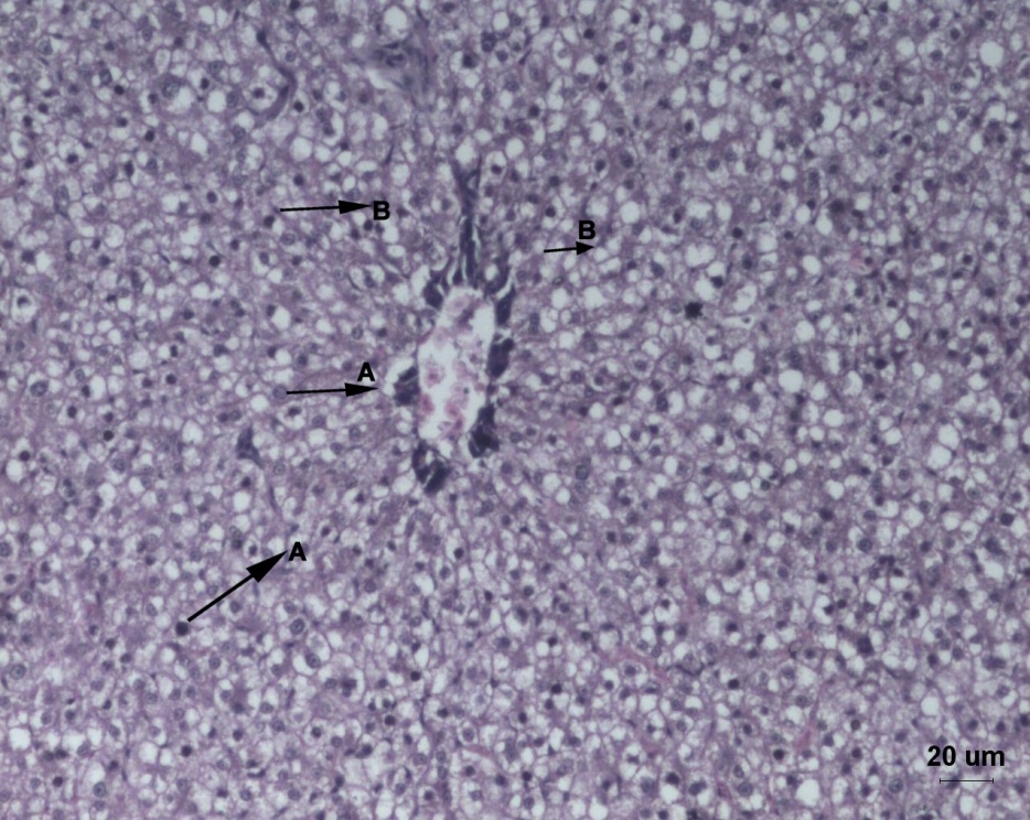 Fig. 5: A Photomicrograph of the liver section of Labeo rohita fish stained with Hematoxylin and Eosin showing A-Hepatocytes with a nucleus, B-Sinusoid. Scale Bar = 20 µm