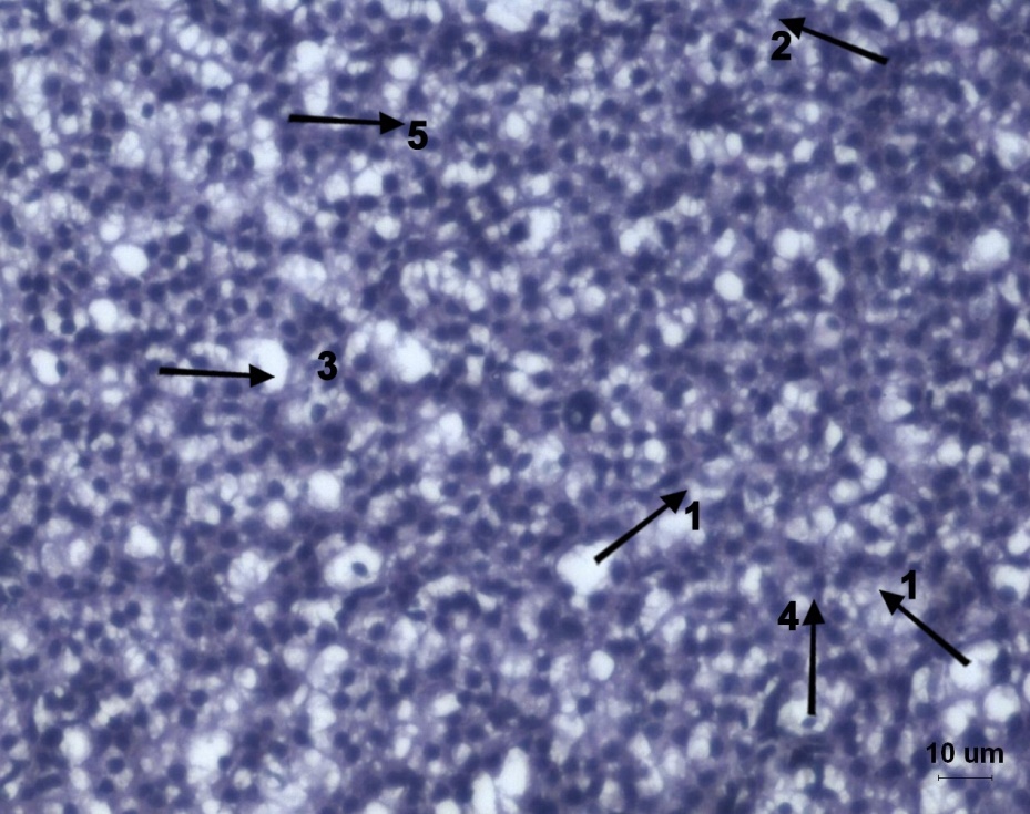 Fig. 6: Histological alterations of liver of Labeo rohita fish exposed to lead acetate and fed with normal fish food stained with Hematoxylin and Eosin showing 1-Vacuolization of nucleus, 2-Cytoplasmic degeneration in hepatocytes, 3-Congestion of blood vessels, 4-Leukocyte infiltration, 5-Hypertrophy of hepatocytes. Scale Bar = 10 µm