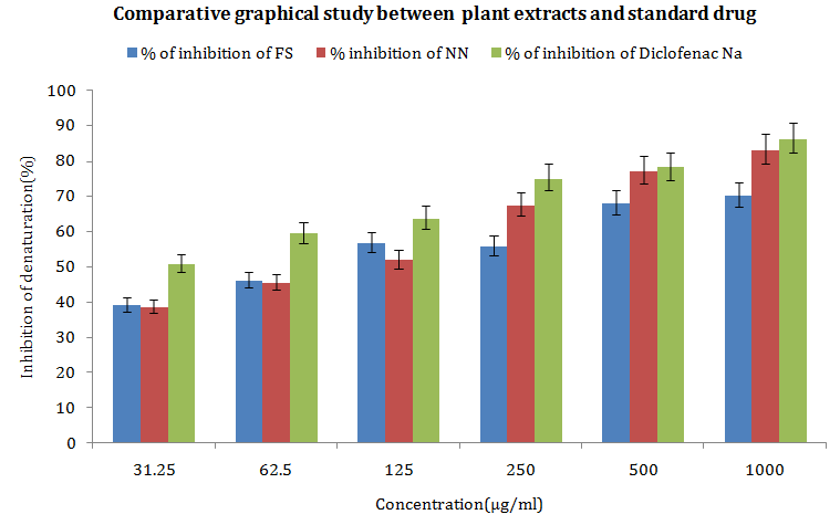 Fig. 2: It shows the inhibition of denaturation (%) of Flemingia stricta, Nymphaea nouchali and Diclofenac sodium