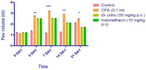 Dr. Ortho decreased the paw volume on day 4, 7, 14, and 21 respectively as shown in table 1.