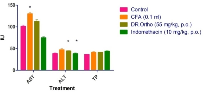 Dr. Ortho decreased (but not significant) the lysosomal enzyme ALT, AST and total protein compared with arthritic rats, as shown in the fig. 2.