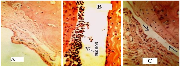 Fig. 3: (A)-TS of the knee joint of normal control rat, showing no mononuclear infiltration and pannus formation [H&E, 100×]. (B)-TS of the knee joint of with bone erosion [H&E, 400×]. (C)-TS of knee joint of with reduced bone erosion [H&E, 100×]