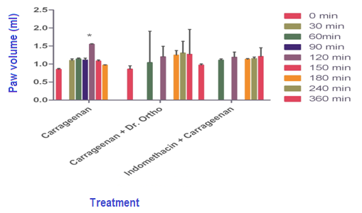 Fig. 4: Effect of Dr. Ortho on carrageenan-induced paw edema in rat Values are expressed as mean±SEM. n=6; One-way ANOVA followed by TURKEY’s multiple comparison test. *P<0.05 vs arthritic control