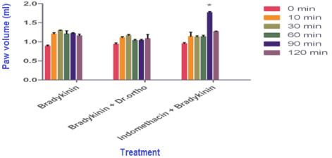 Fig. 7: Effect of Dr. ortho on bradykinin-induced paw edema in rat Values are expressed as mean±SEM. n=6; One-way ANOVA followed by TURKEY’s multiple comparison test. *P<0.05 vs arthritic control