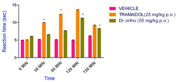 Fig. 8: Analgesic activity of Dr. Ortho using Eddy's hot plate Values are expressed as mean±SEM n=6; One-way ANOVA followed by TURKEY’s multiple comparison test. *P<0.05 vs arthritic control