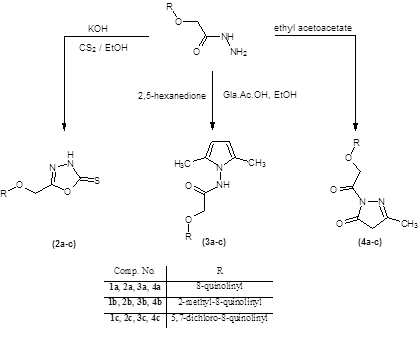 Three different substituted hydrazides were synthesized from substituted quinolinols by multistep reactions. Equimolar quantitities of substituted quinolinols and ethylchloroacetate was allowed to react in the presence of potassium carbonate for 18 h in dry acetone medium to give the ester. The ester obtained was further refluxed with hydrazine hydrate to give the corresponding hydrazides. The hydrazides were allowed to undergo further reactions to prepare 1, 3, 4-oxadiazole-2-thiones, N-substituted pyrrole acetamides and pyrazol-3-ones (Scheme-1).