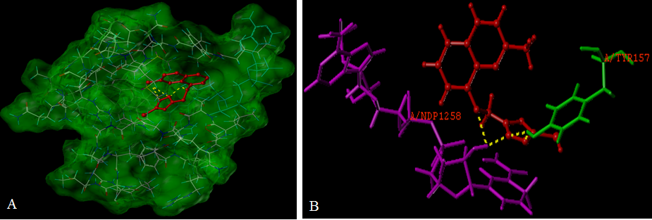 Fig. 1: A) Docked conformer of 2b with the active residue of Fab1 and the substrate NADPH, B) FabI-NAD+-2b complex formation; Red-ligand, Green-Tyrosine 157 of Fab1 and Purple-NADPH