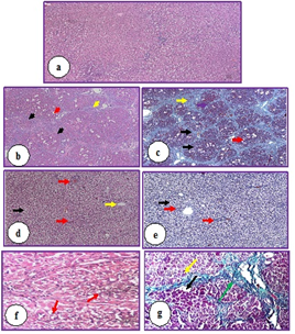Fig. 1: Liver section of control group (a) showed preserved (intact) lobular hepatic architecture and normal morphological appearance. Liver section of CCl4 group (b & c) showed distorted and loss lobular hepatic architecture, formation of micro and macro regenerating nodules (black arrows), mild to moderate ballooning of hepatocytes (red arrow) and moderate infiltration by lymphocytes to portal tract (yellow arrow). Liver section of CCl4 injured rats treated with ethyl acetate fraction (d & e) showed preserved (intact) lobular hepatic architecture, improvement of fibrosis score 2, thin fibrous bands porto-central (red arrow), moderate ballooning of hepatocytes (black arrows) and mild infiltration of portal tracts by inflammatory cells(yellow arrow). Liver section of CCl4 injured rats treated with silymarin (f & g) showed swelling and foamy appearance of hepatoytes (red arrow), hydropic (yellow arrow) and steatosis (black arrow) changes and mild fibrotic tissue (green arrow). a, b, d and f are H&E stained sections. C, e and g are Masson's Trichrom stained sections. Magnification power is 100 x