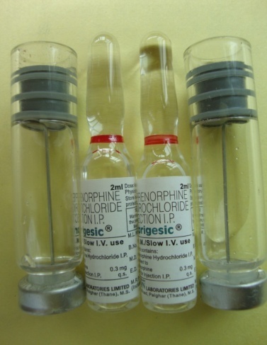 Buprenorphine hydrochloride (0.3 mg/ml, 2 ml/vial) was also procured from M/s Neon Laboratories (Mumbai). After checking for the sterility, the cartridge weight was taken and marked. 0.4 ml of water from the cartridge was removed using a disposable sterile syringe under a laminar flow. The weight of the cartridge was taken again and 0.4 ml of buprenorphine was injected into the cartridge and reweighed. Each cartridge contained 0.05 mg/ml of buprenorphine. The cartridges were stored at room temperature away from dust and direct light.