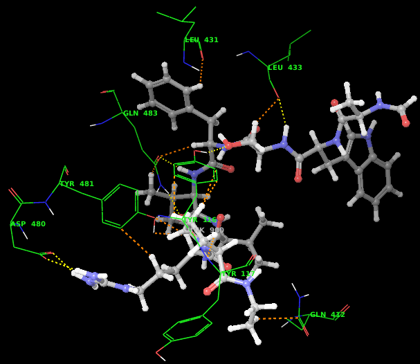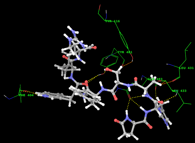 Higher the negative value of the docking score, better the binding affinity of the ligand and receptor. The minimum energy for binding and higher number of hydrogen bonds also indicates good binding affinity of ligands towards the receptor. The docking score of Leuprolide is-14.188. The complex (fig. 6) indicates that amino acids Tyr116, Tyr117, Leu431, Leu433, Asp480, Tyr481 and Gln 483 are involved in hydrogen bonding. Leuprolide forms seven hydrogen bonds with ACRBP/OY-TES-1. Triptorelin (fig. 7) forms hydrogen bonds (Tyr116, Phe404, Leu431, Leu433, Tyr481, Gln483) with a docking score of-13.512. The residues Tyr 116,Tyr 117,Ser 411, Ser 415, Tyr 434, Asp 478, Tyr 481, Gly483 are involved in hydrogen bonding with Naferelin (fig. 8).