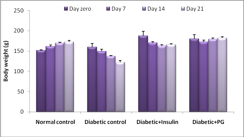 There was a significant reduction in body weight of the animals in the diabetic group with comparison to control. After supplementation with PG peels powder for 14 days, the body weight was notably regained. After 21 days of the supplementation, the animals started to gain their normal weight. With insulin treatment for 21 days, diabetic rats began to regain weight to a lesser extent (fig. 1).