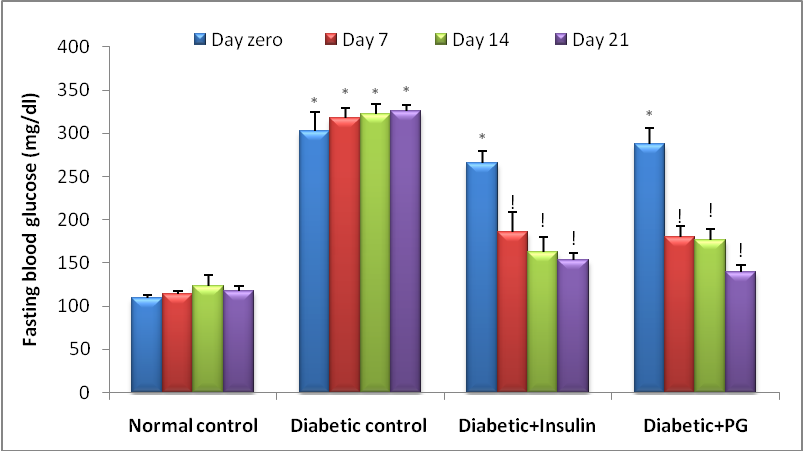 | Groups | Normal control | Diabetic control | Diabetic+Insulin | Diabetic+PG |