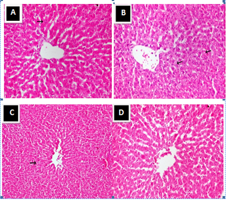 Fig. 3: Liver histopathology. (A) Normal control rat liver showing normal hepatocytes (arrow) with normal radial arrangements around hepatic cords (H&E, x400). (B) Diabetic control rat liver showing increase vacuolation in the cytoplasm of hepatocytes appeared as indistinct clear vacuoles (arrows) indicate glycogen infiltration in diabetes (H&E, x400). (C) Liver of diabetic rat treated with insulin is showing normal hepatocytes and normal hepatic architecture with mild vacuolation of hepatocytes (arrow) (H&E, x100). (D) Liver of diabetic rat treated with Punica granatum peels powder showing normal liver architecture with normal hepatocytes arranged in normal sheets or cord around central vein (H&E, x400)
