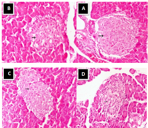 Fig. 4: Pancreas histopathology. (A) Normal control rat pancreas showing normal islets of Langerhans with pale rounded and ovoid β-cells in the center (arrow), embedded in exocrine portion of pancreas (H&E, x400). (B) Diabetic control rat pancreas showing shrinkage of islets of Langerhans with degeneration and necrosis of components cells where its nucleus appeared densely basophilic and karyolysis is evident (arrow) (H&E, x400). (C) Pancreas of diabetic rat treated with insulin showing normal islets of Langerhans with its normal pale large round to ovoid shaped containing cells (arrow) that embedded in exocrine portion of pancreas (H&E, x400). (D) Pancreas of diabetic rat treated with Punica granatum peels powder showing normal sized islets of Langerhans but some degeneration of the β cell in the center were noticed (arrow) (H&E, x400)
