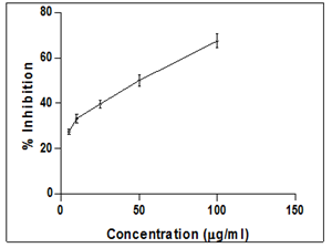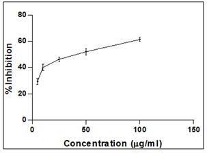 In the assay for in vitro cytotoxicity study, Trypan blue exclusion assay and MTT assay on MEHS showed the direct cytotoxic effect on the EAC cell line in a dose dependent manner with IC50 value of 43.2 µg/ml and 50.3 µg/ml respectively (fig. 1 and fig. 2).