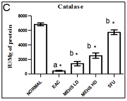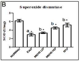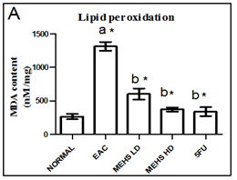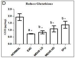 Fig. 3: Effect of MEHS on tissue antioxidant defense parameters like lipid peroxidation (A), superoxide dismutase (B), catalase (C), reduce glutathione (D) in EAC bearing mice. Values are represented as mean± SEM, where n=6. anormal control groupvsEAC control group, *p < 0.05; b EAC control group vs All treated groups, *p < 0.05