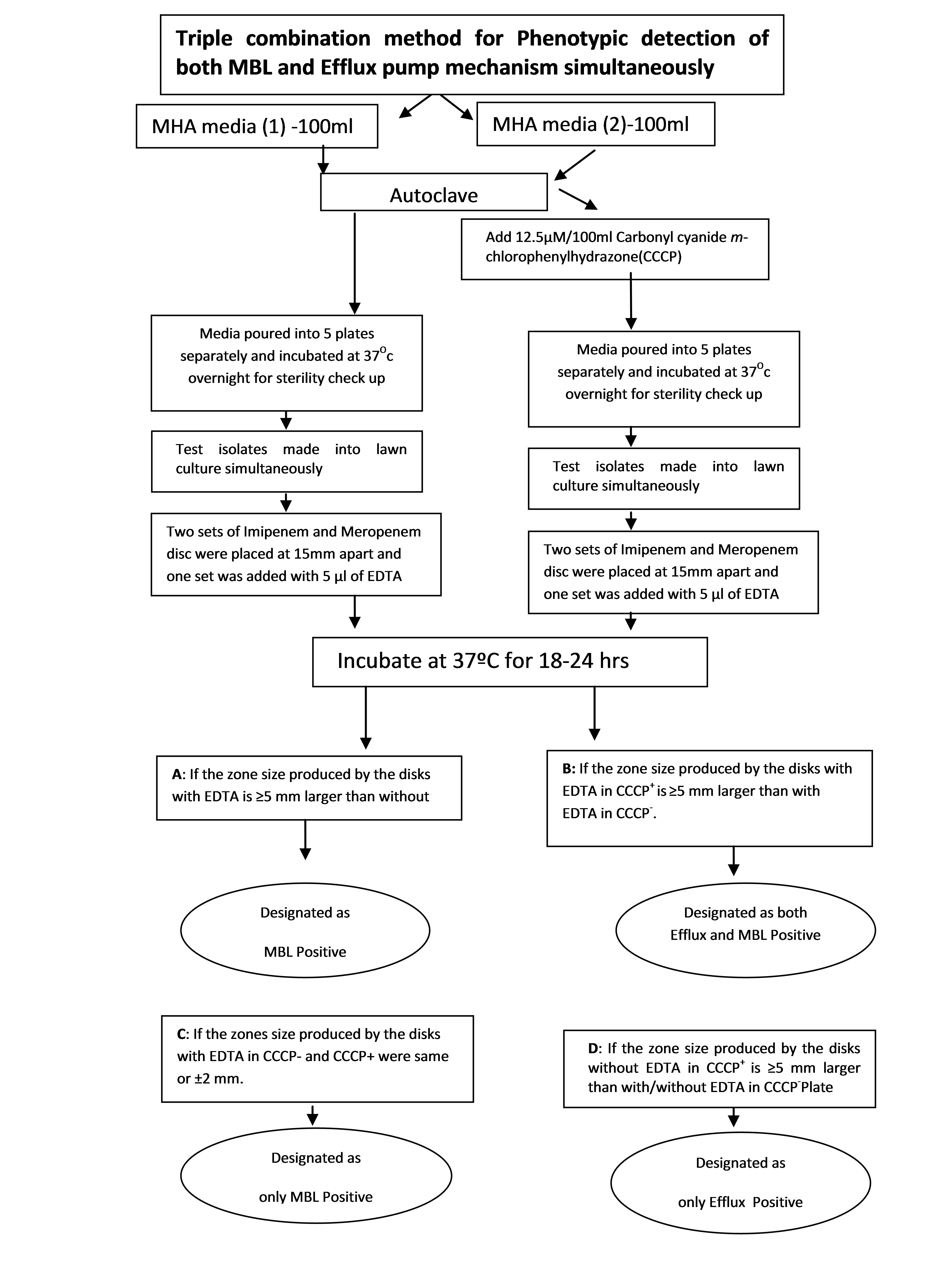 Conclusion: The current study standardized a method for detecting both MBL and efflux mechanism in a single plate consists of CCCP± plate containing antibiotic disk with and without EDTA. Implication of this method in routine diagnostics will help the clinicians to treat the patient with appropriate drug choice and dosage.