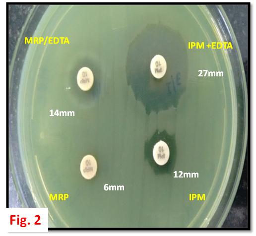Each isolate was inoculated onto peptone water and inoculums was adjusted to 0.5McFarland standard and lawn culture was made onto MHA with CCCP designated as CCCP+ and without CCCP designated as CCCP-plates. Two sets of Imipenem (IMP) and Meropenem (MRP) disc were placed at 15 mm apart in both CCCP± plate and 5 µl of Ethylenediaminetetraacetic acid (EDTA) were placed over one set of the drugs. The plates were further incubated at 37 °C for 18-24 hours. The zone of inhibition was measured and interpreted.