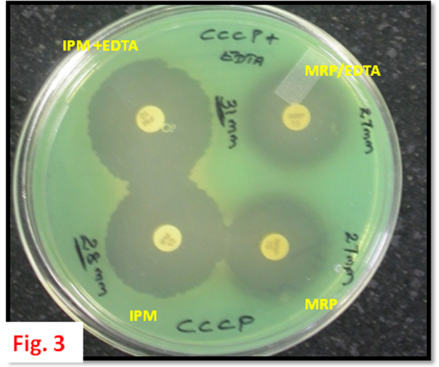 Further, we have standardized a method for detecting both MBL and efflux mechanism in a single plate consists of CCCP± containing antibiotic disk with and without EDTA for the evaluation of both MBL and efflux pump mechanism. Further, we have cross checked that there is no cross effect due to either EDTA or CCCP against bacterial growth using negative control of CCCP+ standard methods with triplicates of bacterial isolate used for the study showed in fig.3.