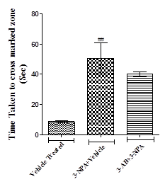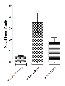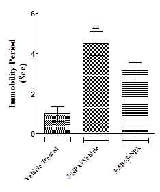 3-NPA mice took longer time (p<0.01) to cross the marked zone and increased immobility period (p<0.01) and number of foot slips (p<0.01) when compared to the vehicle treated normal mice. 3-AB administration showed a non-significant decrease in time taken to cross the marked zone, immobility period and number of foot slips when compared to 3-NPA intoxicated mice (fig. 1).