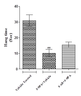 3-NPA mice showed the significant decrease (p<0.01) in hang time when compared to the vehicle treated normal mice. 3-AB administration showed no significant difference in hang time in comparison to 3-NPA intoxicated mice (fig. 2).