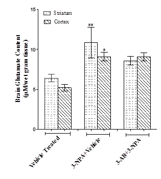 A significant increase in glutamate content was observed in striatal (p<0.01) and cortical (p<0.05) brain regions of 3-NPA intoxicated mice when compared to vehicle treated normal mice. 3-AB administration showed no significant difference in glutamate content when compared to 3-NPA mice brain (fig. 3).