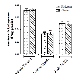 A significant decrease (p<0.01) in succinate dehydrogenase activity was observed in striatal and cortical brain regions of 3-NPA intoxicated mice when compared to vehicle treated normal mice. Pre-treatment with 3-AB significantly (p<0.01) increased the activity in comparison to 3-NPA mice brain (fig. 4).