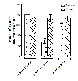 A significant decrease (p<0.01) in striatal ATP and NAD+ contents was observed in 3-NPA mice brain when compared to vehicle treated normal mice. 3-AB administration significantly (p<0.01) increased the striatal ATP and NAD+ contents in comparison to 3-NPA mice brain (fig. 5). There was no difference in cortical ATP and NAD+ contents between the groups.