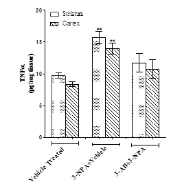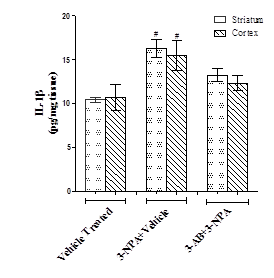 A significant increase in TNFα (p<0.01) and IL-1β (p<0.05) levels were observed in striatal and cortical brain regions of 3-NPA mice when compared to vehicle treated normal mice. There was no significant decrease in striatal and cortical TNFα and IL-1β levels in 3-AB administration were observed when compared to 3-NPA mice (fig. 6)