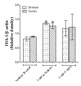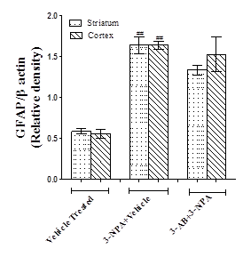 A significant increase (p<0.01) in GFAP and IBA-1 expressions were observed in striatal and cortical brain regions of 3-NPA mice when compared to vehicle treated normal mice. Pre-treatment with 3-AB showed no significant difference in GFAP and IBA-1 expressions when compared to 3-NPA mice (fig. 7).